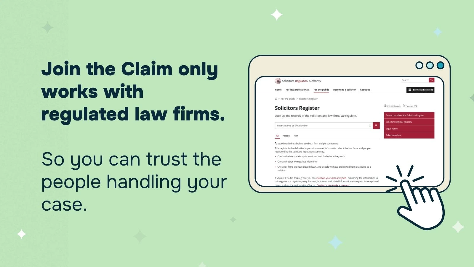 Join the Claim only works with SRA-authorised law firms – so you can trust the people handling your case.
